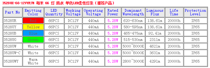 產(chǎn)品規(guī)格:66燈/米 3528 SMD LED 防水柔性燈條